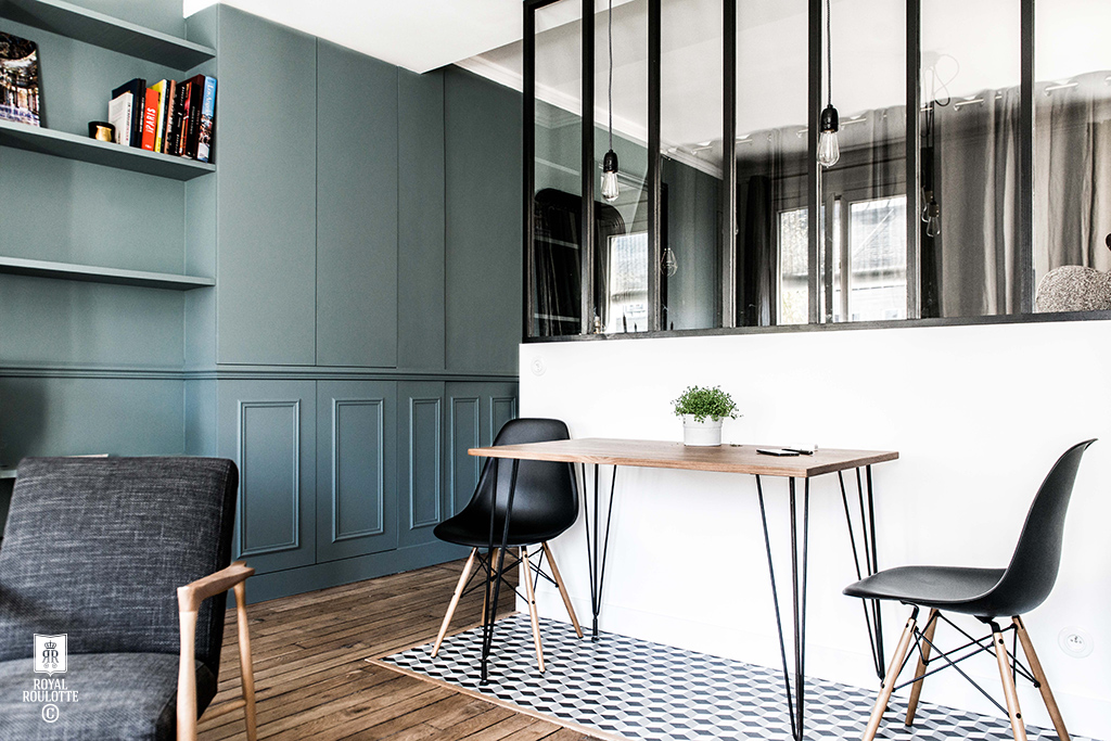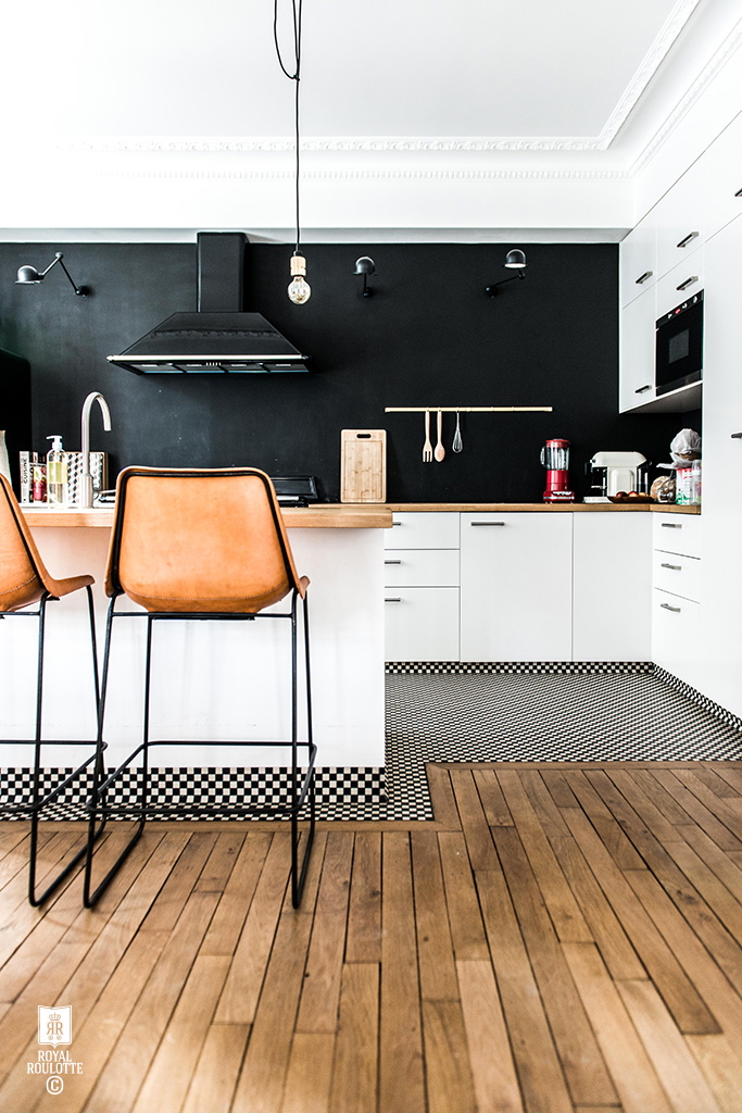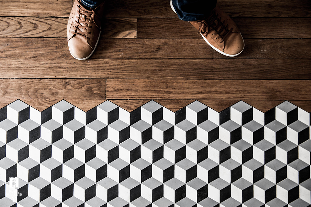 Le cabinet d’architectes intérieurs Royal Roulotte basé à Paris fait des merveilles en la matière. Voici quelques projets différents, soit avec une démarcation claire entre le carrelage et le parquet (d’une pièce à l’autre), soit une démarcation au sol entre 2 espaces, impliquant un « encastrement », ou plutôt une découpe du parquet pour intégrer harmonieusement le carrelage. Bluffant !