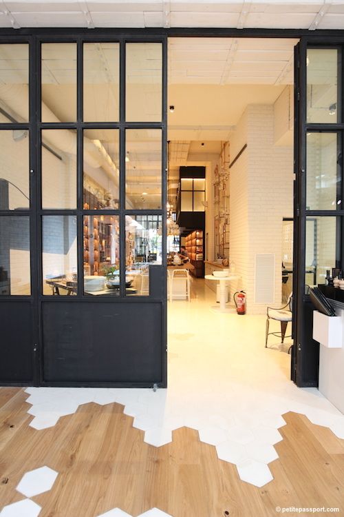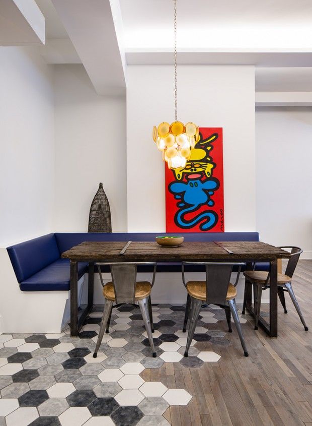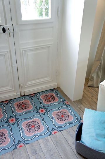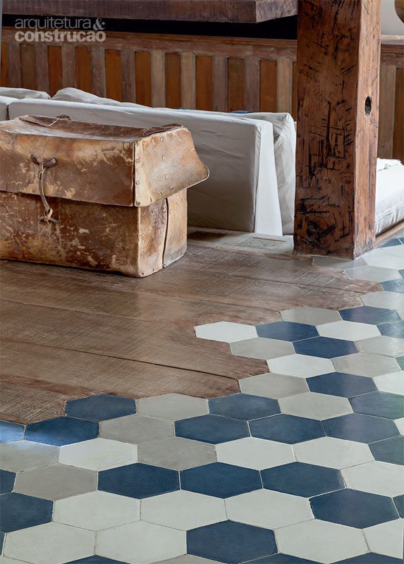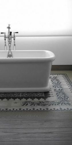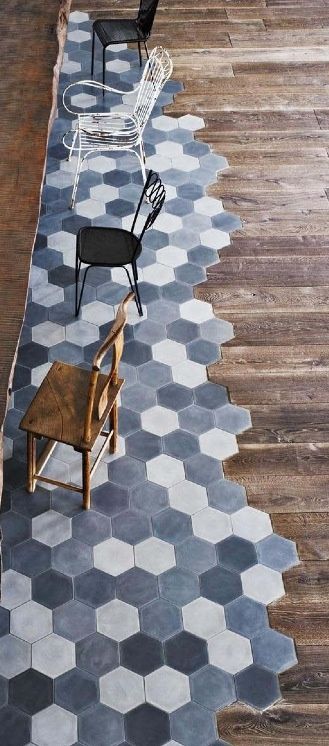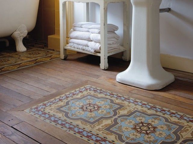 Sur un parquet, on pose un carrelage tel un tapis, complètement intégré et pourtant si différent. Le mix des matières est vraiment intéressant, en jouant sur l’effet visuel, géométrique. On joue l’opposition entre les motifs, les couleurs, les matières, l’effet chaud / froid, le tradi / moderne. Florilège sur pinterest :