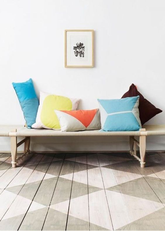 Le parquet est un matériau solide, résistant… et qui donne tellement de possibilité en matière de décoration intérieur ! Que vous suiviez la forme des lames de planchers (lames rectangulaires, parquet marqueté) ou que vous vous affranchissiez des lignes rectilignes, tout est possible ! Voici un petit florilège de formes géométriques, d’association de dessins et de couleurs :