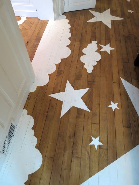 Le choix des couleurs est important car il doit correspondre à l’ambiance et la décoration de la pièce. Ceci dit, libre ç vous de vous faire plaisir. Soit on peint la totalité d’une seule couleur, soit on mix plusieurs couleurs, soit encore on ajoute de la couleur et on laisse apparent le parquet brut en dessous : c’est au choix !